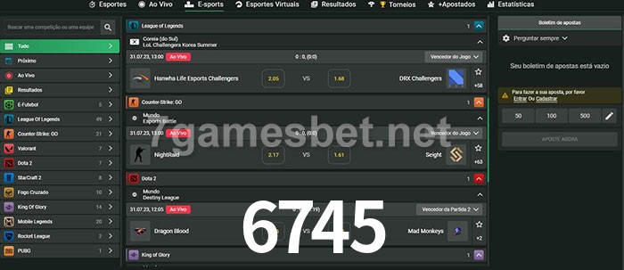O 6745 oferece uma grande seleção de opções de apostas em e-sports com probabilidades competitivas